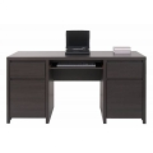 Stôl je vyrobený z kvalitných laminovaných materiálov, ktoré zabezpečujú jeho dlhú životnosť a odolnosť voči každodennému používaniu. Po stranách sa nachádzajú dve priestranné skrinky s dvierkami a zásuvkami, ktoré poskytujú dostatok úložného priestoru pre dokumenty, kancelárske potreby či techniku.