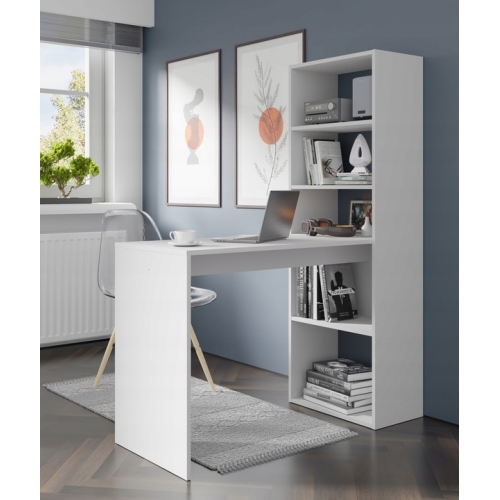 Stôl v čistom, modernom prevedení biely mat poskytuje dostatok miesta na prácu a štúdium. Pripojená knižnica so 4 policami ponúka veľkorysý a funkčný úložný priestor na knihy, dokumenty a príslušenstvo, čím vám pomáha udržiavať organizovaný a efektívny pracovný priestor. Jeho atraktívny dizajn a priestranné usporiadanie z neho robia pohodlný a štýlový doplnok do každej miestnosti.